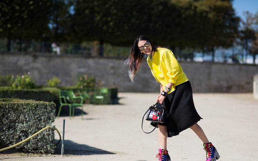 We didn't know that parisian style meant rainbow platforms and comfy sweats! Irene Kim shows us how it's done in her funky look from Paris Fashion Week Day 3, shot by our photographer Michael Dumler of On Abbot Kinney. With all of the incredible and high-end looks drifting down the various runways during Fashion Month, it's super refreshing to get a glimpse of the off-duty street style that really fuels our inspiration. It's no secret that we've got a sweet tooth for any and everything eclectic, so in the spirit of our street style coverage we are showing you exactly how to get Irene's fun outfit using our fave pieces from NYLONshop.
