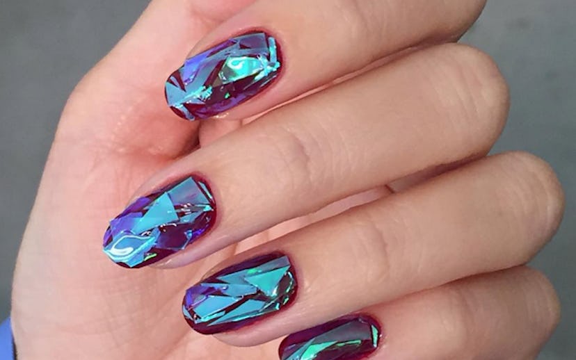 The mastermind behind this iridescent, mirror-like look is Eun Kyung Park, the founder of Unistella salon in Seoul. Using shards of cellophane, Park gives each nail its own unique, reflective look that pairs well with any nail color—neutral for a diamond-like effect and jewel-toned to evoke images of luxe sapphires, rubies, or emeralds. There's no mystery why these transfixing designs have become such a hit: Who wouldn't want their nails to look like literal gems?
