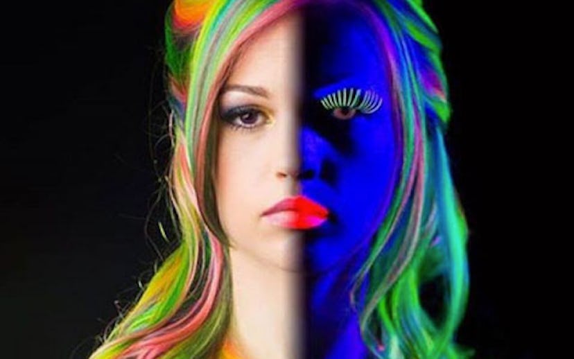 If I had to pick one good phrase that came out of 2015, it would honestly be "glo up." I'm still going through it so I can't report every single detail, but I'm thoroughly enjoying the process. This year, we've been exposed to a lot of bizarre hair trends like rainbow roots and pearlescent. Now, we're finishing off strong with something that's totally out of this world: glow-in-the-dark rainbow hair. Naturally, the trend sparked in collaboration with the new Star Wars film. (Search #starwarspoplocks on Instagram.) Las Vegas-based makeup artist Mishele DiMaria is a pro at applying it, as you can see on her page where multi-colored waves radiate underneath black light.