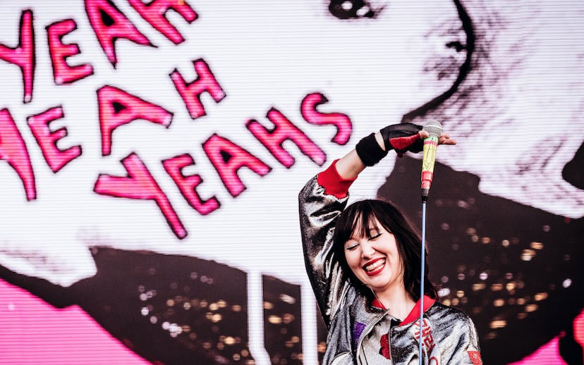 We don't know what's better: this giddy smile from Yeah Yeah Yeahs' frontwoman Karen O or the fact that she stage-dived like a champ into the crowd during "Cheated Hearts."