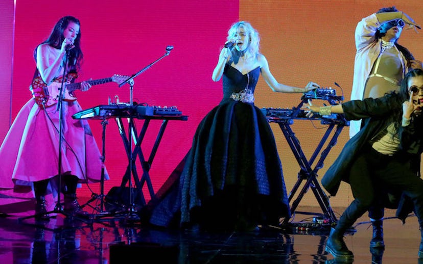 It’s been six months since Grimes unleashed her phenomenal fourth album Art Angels onto the world, so it’s about time Jimmy Fallon invited her to sing a song on his show. Along with HANA on guitar and her two trusted dancers, Grimes, rocking an electric guitar and a gothic black ball gown, stormed the Tonight Show stage with an elaborate performance of the album’s lead single, “Flesh Without Blood.”