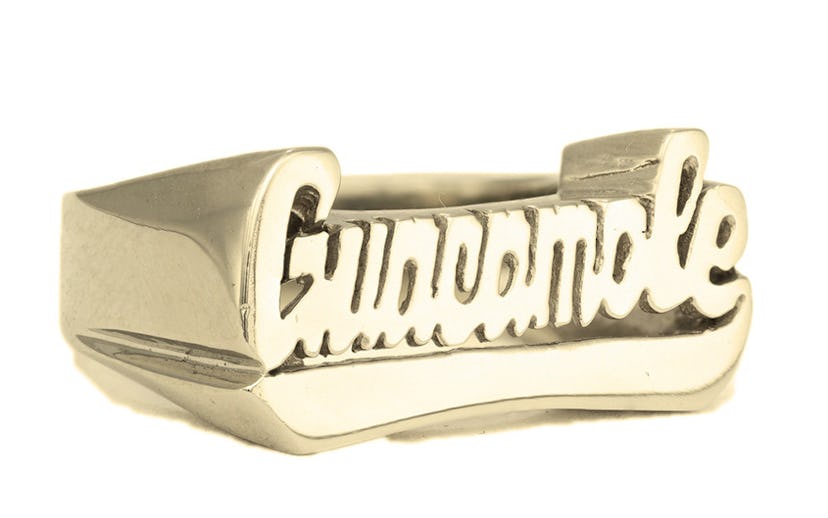 Thank heavens for holy guacamole with this engraved brass ring from GroundscoreNYC, a collaboration between two of our favorite Brooklyn bling brands, Snash Jewelry and Leroy's Place. Thanks to the new jewelry line, you can also proclaim your undying love for