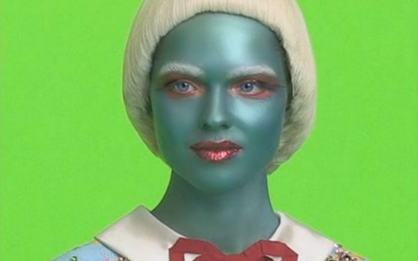 In the new #GucciAndBeyond clips, we meet a number of strange characters. From the very green Kerelanda, from planet Xoph, to Xeod, a silver being with telepathic powers, these extra-terrestrial beings certainly aren’t the typical models we've seen in Alessandro Michele’s campaigns. (Especially true for the unknown glittery-eyed alien wearing a floral robe).
