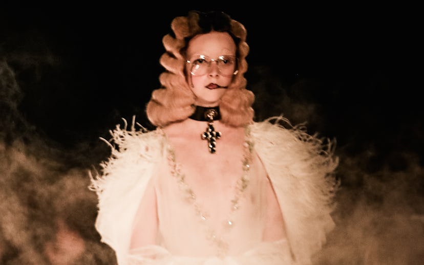 Inspired by a "rave in a cemetery," the show took place after nightfall in Alyscamps, a former Roman cemetery in France, amidst plenty of fog and literal fire on the runway. According to Gucci creative director, Alessandro Michele, the setting, a promenade in the 1700s, was less of a cemetery and more of “a place where everyone can be someone else, widows and kids playing rock stars, ladies who are not ladies,” per the brand's Twitter account.