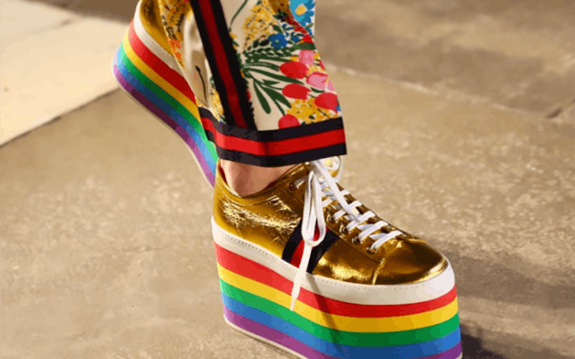 While the collection was colorful and quirky (as expected from Michele)—from neon orange fur and plaid ball gowns to embroidered cats and dogs—one item stood out to us in particular. A pair of lace-up golden creepers with a sky-high rainbow platform that stomped their way down the runway and straight into our sartorially-minded hearts.