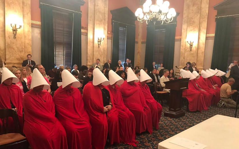 During the first hearing for Ohio Senate Bill 145, which would effectively ban and criminalize second trimester abortions, a group of women showed up dressed as characters from Hulu's The Handmaid's Tale. Based on Margaret Atwood's 1985 dystopian novel, the show depicts life after the U.S. government has been overthrown by a totalitarian regime, where women who are fertile are forced to bear children for their "commanders."