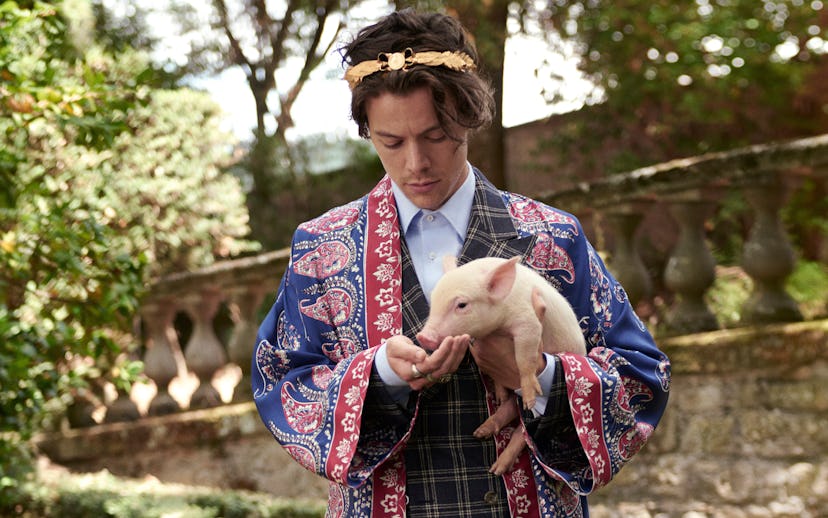 On Tuesday morning, Gucci creative director Alessandro Michele blessed us with the campaign for the new Gucci Cruise 2019 tailoring collection, which features Styles posing in a garden and playing with a lamb, a goat, and a piglet. They are everything we’ve ever wanted from a fashion campaign, and more. A well-dressed man snuggling a tiny pig and looking lovingly at a lamb? Our hearts have melted.