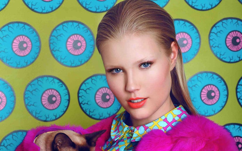 As if kooky patterns and a neon pink faux fur bomber weren't enough to make you throw out your basics and invest in a wild wardrobe, Elsaesser also created matching looks for a friend's cat, Heathcliff. "Heathcliff was amazing and was actually falling asleep during the shoot. I think the adoration from all the girls on set really tired him out," Elsaesser said. "He just so happens to be a boy cat, but he rocks those dresses better than any girl cat could." Cross-dressing cats are where it's at, clearly.