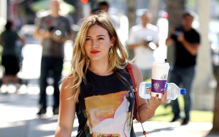We're slowly coping with the temperature's cooling with a little help from our friends, namely Hilary Duff, whose totally autumn-ready outfit is helping to convince us that September isn't so bad. Duff's printed tank, grey skinny jeans, and black booties look like an outfit ripped from a September magazine (like ours!), which when paired with dark makeup gives off the perfect I'm-not-trying-I-just-look-this-cool-24/7 vibe.