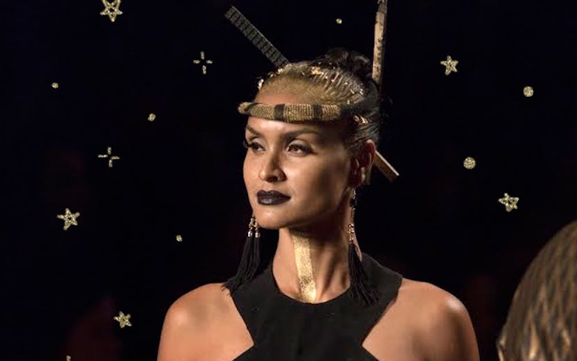 "Kiki pūkai, also known as hāwena, was practiced by royal women in ancient Hawaiʻi who bleached their hair at the hairline as a sign of chiefly status. I used gold hair and body paint to represent that tradition, then embellished it with gold leaf flakes to further evoke luxury and status," says lead hairstylist Arthur Wilson on the inspiration for the gorgeous look. The end beauty result was stunning, landing somewhere between badass and goddess. And let’s be real, I’m totally stealing this idea for my New Year’s Eve look. Maybe sans the body paint—maybe.
