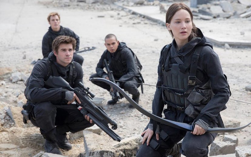 Though we’re not opposed to going to the club on the second day of the work week, we’re pretty sure something big regarding the movie franchise is going to happen. Only two posters have been released; each are haunting but hardly reveal any clues to the final installment of the series. The two photos released don’t offer much insight, either. Lawrence’s Katniss Everdeen looks pretty badass crouching in her battle gear with Liam Hemsworth’s Gale & co. Meanwhile, Hutcherson’s Peta is just chilling in the dark, which, well, isn’t out of the norm (he always seems to hang in shadowy places). We’re happy to see him out of the hospital, though!