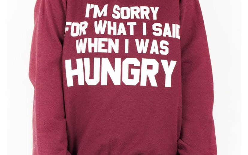 When I was a little kid, my "hunger-related mood swings" were so severe that my mom would bring little snacks with her everywhere we went in an effort to keep me from going postal on random people at the playground, mall, aquarium, or whatever, because of low blood sugar. Thanks to her vigilance, and I guess, my metabolism straightening out as an adult, I am proud to say that I have maintained a criminal record free of anger management-related blemishes. I think I'll wear this sweatshirt as a warning to innocent by-passers of what could have been, had they met me when I was eight.