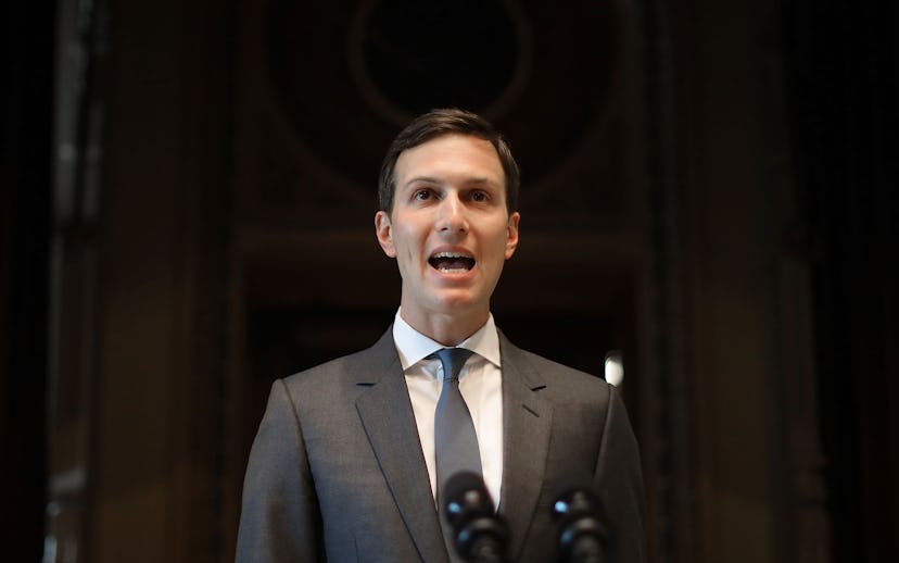 He's so far been doing all of this in complete silence. Until today, no one really knew what Kushner sounded like. John Oliver speculated what Kushner might sound like on his show a few weeks ago, airing a clip of Kushner with Gilbert Gottfried playing over him. While Kushner's actual speaking voice isn't that grating, it's still jarring to finally hear words come out of his mouth after months of watching him stand around looking like a prepubescent teenager trapped in a Hugo Boss ad. It's especially jarring when you realize he sounds a little like a Real Housewife of New Jersey.