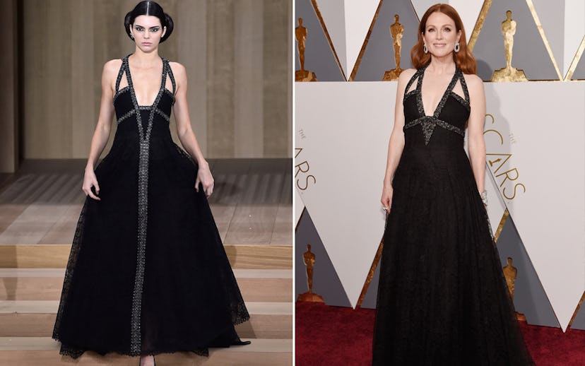 Is Julianne Moore taking style cues from the Kardashian-Jenners? This may be the case. If you caught Moore on the Oscars red carpet last night, you may have noticed that the frequent best-dressed actor’s gorgeous custom gown by Chanel Haute Couture looked a little familiar. Well, that’s because it was inspired by the very same design that Kendall Jenner wore down the runway last month in Paris.