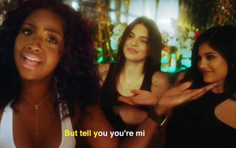 There is no human being in their right mind that doesn't like karaoke. It's an indisputable fact. That's what makes Justine Skye's new music video for her song "I'm Yours" so fun to watch. Or maybe it's because the setting is the opposite of the grimy rooms that karaoke-goers usually flock to. Or most likely, it's because it stars a ton of random Instagram personalities, as well as Kendall and Kylie Jenner, who give a delightfully awkward lip sync performance. Sure, the entire video is designed to have people talk, tweet, and snap about it, which they have been, all to the sounds of Skye's sweet, sweet R&B.
