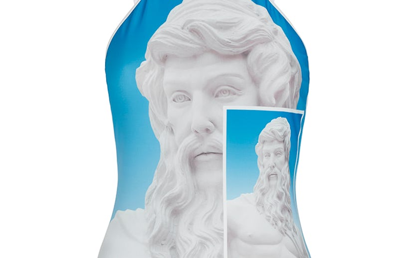 Špetić’s choice of shell and marble poseidon prints not only evoke the hip, Net-girl beneath, but they also frame the body to accentuate any curve. Her blend of feminine silhouettes and colors, with strong, masculine visuals provide the perfect look for the modern girl on the go—who’s singular destination is her beach chair. But why save such great looks just for those moments in the sun? The halters and one-pieces especially would look scorching with shorts or a skirt for a bold daytime look that brings the sand and surf to the sidewalk.