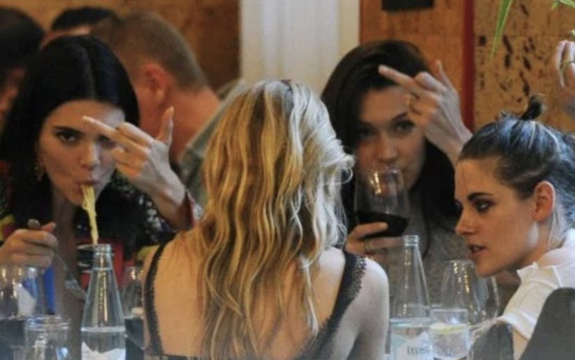 The now-iconic photo captured the foursome at a restaurant, with Jenner and Hadid, who are facing the camera, shown eating pasta, sipping wine, and flipping off paparazzi. A 2018 mood, indeed.