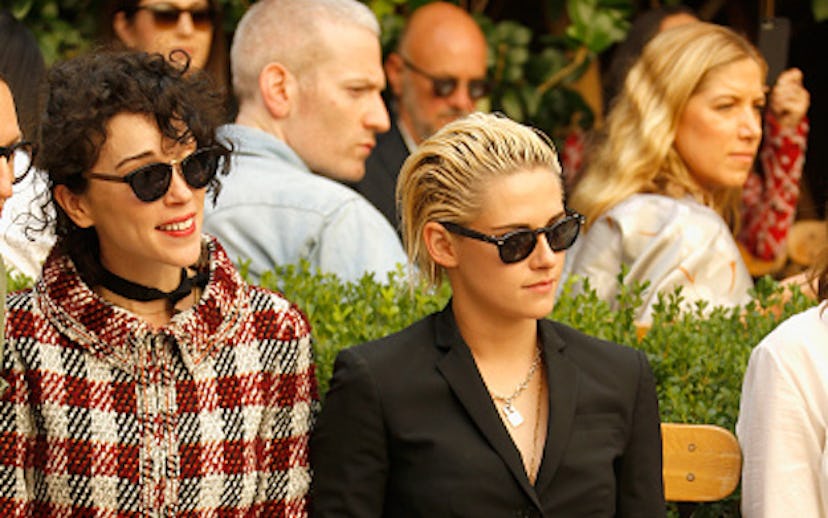 Even though the pair has been spotted doing pretty much everything lately (which begs the question, how exhausting must it be to go through the rumor mill every time you're spotted existing next to someone?) they seemed to make things official at the recent CFDA/Vogue Fashion Fund show. The two arrived together and sat (somewhat) snuggled up in the front row (alongside Jenna Lyons, Emma Stone, and Katy Perry) in all their gorgeous, sunglassed glory. Style-wise, Stewart opted for a sleek and black suit jacket that showed just the slightest hint of midriff, along with cropped black-and-white checkered pants and some super-shiny loafers. St. Vincent's outfit was kind of the inverse, with a textured and checkered black, white, and red crop jacket paired with wide-legged black pants and a long gold necklace. We're also kind of loving the contrast between Stewart's slicked-back blonde hair and St. Vincent's dark, wild locks, but we digress.