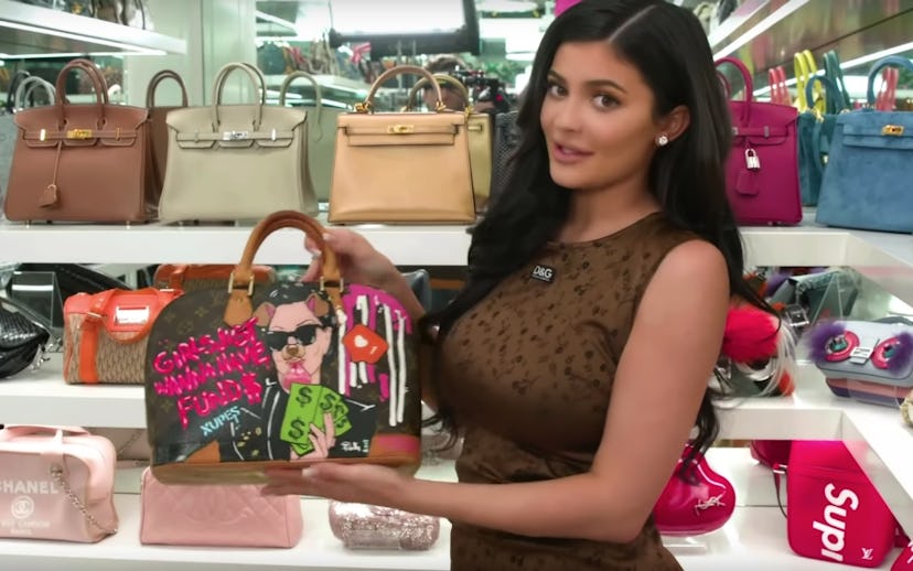 The rest of her collection consists of brands like Chanel and Dior and Gucci, but our personal favorite is a present she received from none other than mother Kris Jenner. It’s a painted bespoke Xupes x Year Zero London Louis Vuitton with Kris’ face and the Snapchat dog filter painted on it. The text on it reads: “Girls Just Wanna Have Fund$.” Kylie explains: “She knows how obsessed I am with her, so she got this really cool piece from an artist.” She quickly moves on to other bags her momager has given her over the years, not spending nearly enough time on the backstory of the LV bag. Like, who came up with the idea? What was her reaction when she got it? Does it cost as much as we owe in student loans? Probably.