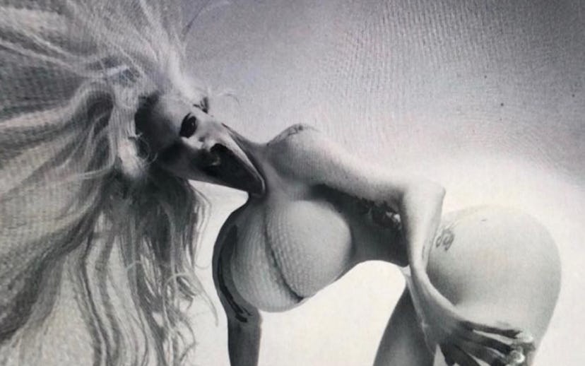 Yesterday, Gaga posted the freaky, Eli Russell Linnetz-shot images to her Instagram, sans any context. One photo sees a digital manipulation of Gaga's side profile—her nose extended to a sharp point. Another photo warps her body into some extreme proportions, while the final image sees her posing with what appears to be a wolf mask around her pelvis.