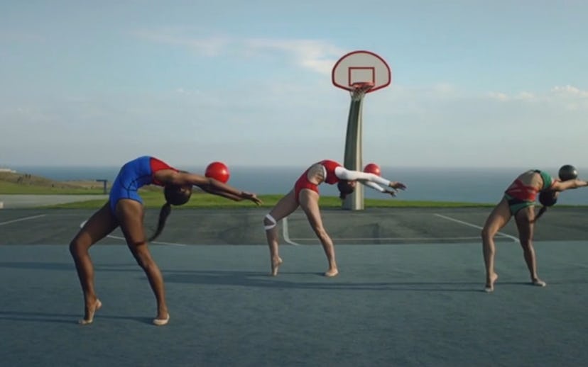 In the clip, Nastasya Generalova, Aliya Protto, and Gabrielle Lowenstein perform their routines on a basketball court against a breathtaking ocean-view backdrop. The primary color palette references Jean-Luc Godard’s classic 1966 French new wave film Pierrot le Fou. “We thought these tones would help delineate and emphasize the girls’ movements,” Gálvez told The Nowness.