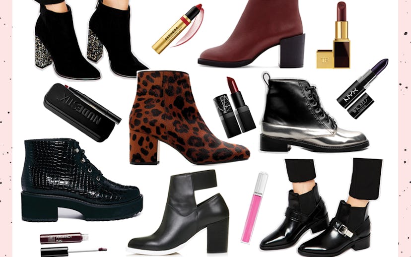 Call us superficial, but if we're rocking badass boots and our lips are coated in a bright color, we feel ready for anything. So we decided to honor that feeling and put together boots and lipsticks that complement each other—like a burgundy leather bootie with a deep matte red stain, and a punk-inspired combat boot with edgy purple lipstick. Because once our lipstick and boots are coordinated, we can worry less about the rest of our outfits. After all, if you're wearing red lipstick and leopard print booties, what else do you really need?