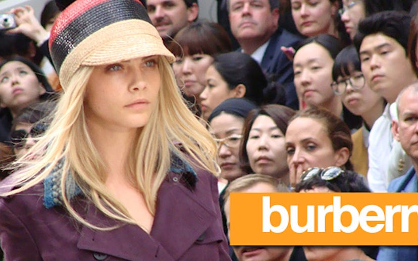 I want to be part of the adventure!" (Cue the Love Actually casting director.) The thing is, the Burberry Prorsum show kind of connected to that little boy's desire for some sort of epic journey, even if it was unknown, and scary, and slightly too big for his tiny Converse sneakers. To get into Burberry's massive fashion tent, you have to wind through a series of wrought-iron gates, then a series of humorless security matrons who call you "love" as they check your ticket to make sure it's not fake. (How anyone can fake a piece of wood burned with Burberry's signature check, I'll never know...) Once inside, you walk straight into a 3-D projection of Rosie Huntington-Whitley, who's posing with an eerie plum smile as glitter falls all around her trench coat in 3-D. If you saw the Kate Moss / Alexander McQueen version at the Met (or, if you were really lucky, on the Paris catwalk circa 2006), you know a fashion hologram can be an unsettling and magical experience. This one certainly is. Onto the inner sanctum, where Kanye West, Sienna Miller, Rachel Zoe, and Lily Donaldson cram onto the front row bench while Skins darling Kaya Scodelario, model Julia Restoin-Roitfeld, and various members of The Heartbreaks sit further back. Cara Delevingne opens the show while her sister Poppy snaps photographs and proudly grins to her seatmate, Hayley Atwell. There are raffia trench coats and snakeskin lock-belts, and striped straw baseball hats that your senior fashion editor, Michelle Reneau, needs.