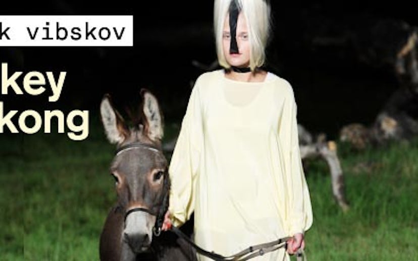 Now Danish designer Henrik Vibskov gives his models an even bigger challenge with donkeys. They're tied to the girls' wrists like massive accessories, accompanying a collection that's part Peruvian folklore and part outerspace.