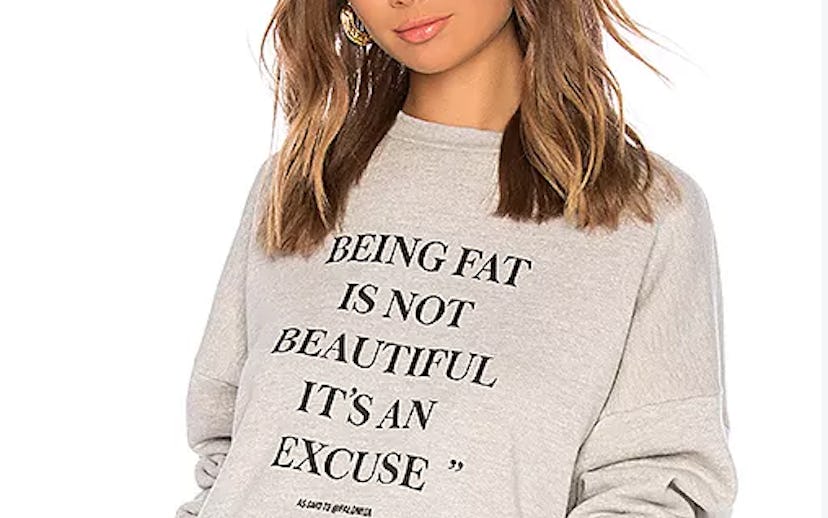 London-based artist Florence Given posted the listing to her Instagram page, calling out the brand for “selling fat phobia to rich skinny women.” And it's not just that it's being modeled by someone thin, it also doesn’t come in a wide range of sizes. Other sweatshirts included quotes like, "Too Bony To Be Boned" (as reportedly said to Delevingne) and "Horrible Result Of Modern Feminism" (as reportedly said to Dunham). While the sweatshirts were supposed to reclaim harmful words said to the women involved, they actually work to reinforce them.