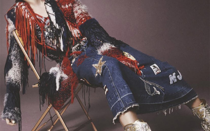 Donigan, shot by photographer David Sims in a denim-patched miniskirt, metallic gold boots, and a dark lip, was first noticed by Jacobs for wearing one of his sweaters during an episode of Drag Race. Jacobs wrote on his Instagram that his “unique, artistic drag sensibility” had reminded him of his earlier club days. He then realized Donigan used to work at a Marc Jacobs retail store, which urged the designer to get in touch.