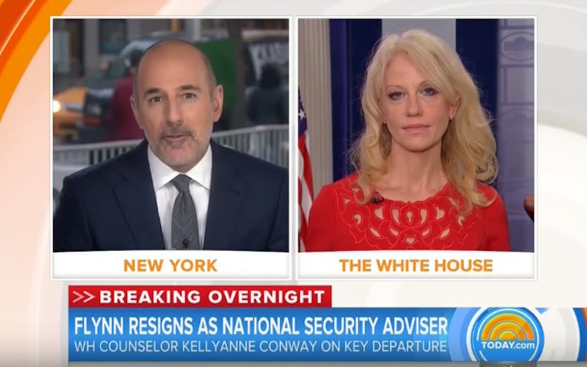 While some have claimed that Conway didn't lie, but was rather just out of the loop, she denied that possibility this morning when she appeared on the TODAY show to address the Flynn resignation. Speaking to Matt Lauer, Conway, lacking her usual energy and appearing as if she'd underslept, said that Flynn had become a “lightning rod,” and thus chose to resign. But as Lauer correctly pointed out, the White House knew about the phone calls last month, after the Justice Department alerted them and warned them that Flynn was a potential blackmail target for the Russians. “Well that’s one characterization,” Conway said. “But the fact is General Flynn continued in that position.”