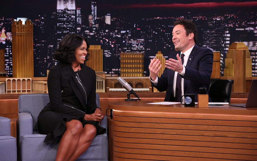 Naturally, Michelle's first note was dedicated to her husband. "Thank you, Barack, for proving you're not a lame duck, but my very own silver fox," she said. Fallon, in turn, wrote his to FLOTUS. "Thank you, Michelle, for bringing a whole new meaning to the phrase 'the right to bear arms,'" he read aloud as a picture of Michelle flexing her biceps popped up on the screen.
