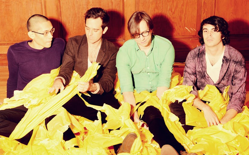 Listen to the song and you'll know why: It's got this David Bowie-esque rock theatricality that's somehow sexy, dark, and modern, all at the same time. It probably helps that Kyle Wilson delivers lines like, "I never hated anyone so much for keeping me close / But we were in love / It was a long time ago," in a deep croon, guitars howling in the background, or that the thump-thump synths and insistent bassline propel it forward. The track is off of the Brooklyn quartet's sophomore album, Violent Light, out February 25 on Kill Rock Stars, and is clearly a very good sign of what's to come.