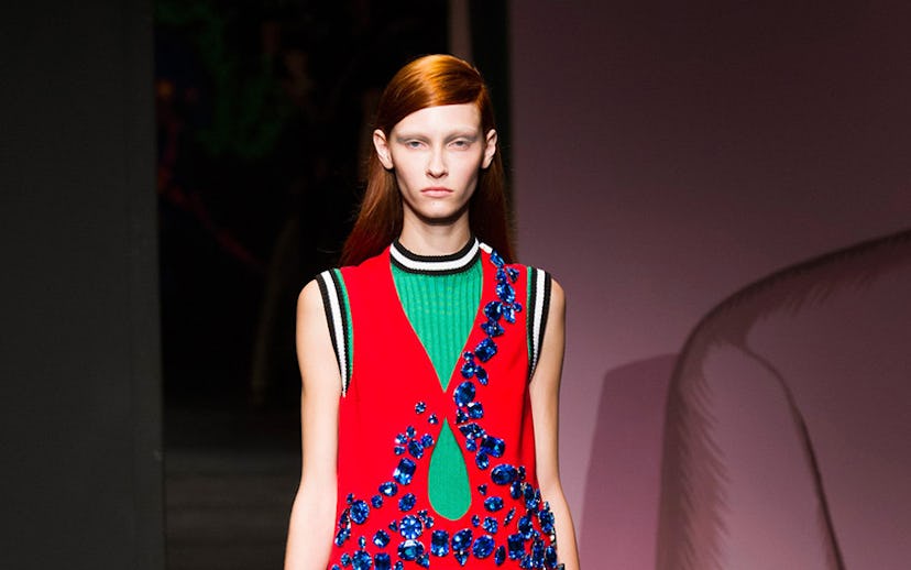 PRADA Part socialist, part feminist, and part Rainbow Brite, the Prada spring '14 was a beautiful and kooky assemblage of ideas. We learned the importance of tube socks, Britney Spears songs, and bedazzlers--all things we knew we loved, but sort of forgot about. Thanks for the reminder, Miuccia! -- STEFF YOTKA
