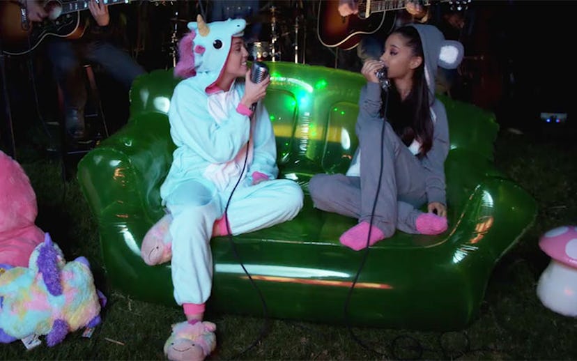 For all intents and purposes, Miley Cyrus and Ariana Grande should not be friends. The two young divas who both transitioned from kids' TV sensations to chart-topping, social media-dominating pop stars are destined to be rivals. Instead, they absolutely adore each other, as evidenced by this dreamy video in which the two singers, dressed in Kigurumi onesies, glide through a lovely rendition of Crowded House's 1986 hit, "Don't Dream It's Over."