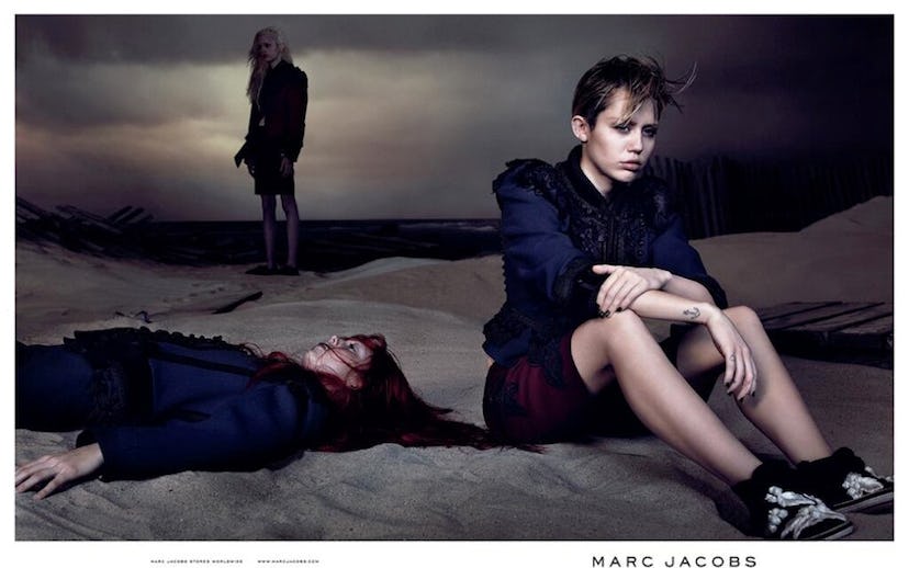 Based on the Marc Jacobs spring '14 show modeling lineup that included Sky Ferreira, Georgia May Jagger, and Charlotte Free, we could have guessed that the brand's campaign would feature a big star, but we're more than thrilled to see that it's Miley Cyrus. Cyrus and Jacobs have been besties for a long time--she wore a fishnet dress by the designer to the Met Gala in 2013 and can currently be spotted nude on a Jacobs approved T-shirt supporting the NYU Skin Cancer Institute--so it was really only a matter of time before she starred in one of the designer's ads.