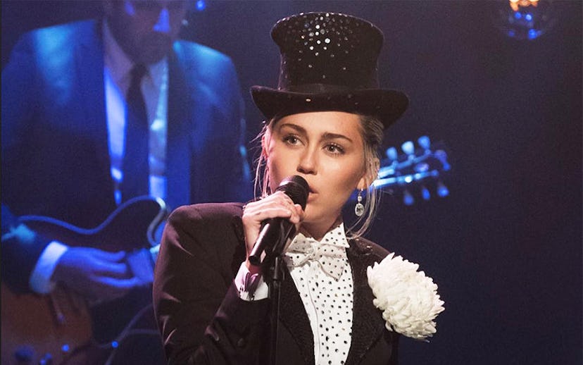 Queen of covers Miley Cyrus helped kick off Maya Rudolph and Martin Short’s new variety show, Maya & Marty, with a little gender fluidity. With a nice nod to iconic Victor Victoria, Cyrus began her musical performance with a cover of Leonard Cohen’s “I’m Your Man.” Her vocal delivery was outstanding, and that top hat is what sartorial dreams are made of. She then moved onto her next favorite thing (nudity) and ripped away her coattails to reveal what was hiding underneath—a fancy leotard. The top hat came off as Cyrus launched into the next phase of her gender-bending medley: a cover of Peggy Lee’s “I’m a Woman.” Rudolph came out to accompany her, and all fared well in the world of gender, performance, and gender performance.
