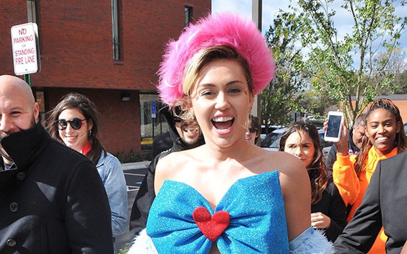 Saturday morning, dressed like her own version of the American flag—sporting a large blue bow top with a red heart in the middle, a red and white striped skirt, and a fuzzy blue sweater—Miley Cyrus, along with members of the media, went door to door in the dorms of Virginia's George Mason University to campaign for Hillary Clinton and remind students to vote. She may or may not have also played Mario Kart.