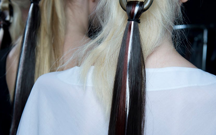 But Missoni takes that concept to the next level, with what is arguably one of the cooler--or, depending on your point of view, edgier--looks we've seen yet during the spring '14 shows. The hair itself is nothing too fancy; it's just a low ponytail with the hair pulled half-through the elastic, like the faux-buns you do when you're running late to a dentist appointment or on your way to yoga class. But here's where things get tricky: Wella Professionals' Global Creative Director Eugene Souleiman brought in an "urban chic" look by adding a circular accessory--with its own faux hair dangling from it--to the loop of hair. It's as if you turned a carabiner into a beauty tool (or just wanted to play around with some different color tresses without having to dye your own).