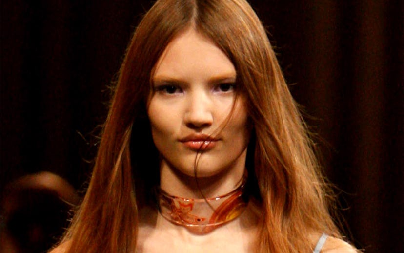 Not only are we glad that our favorite early aughts beauty trend is having a moment yet again, but we're extra-excited about the solution posed by Miu Miu makeup mastermind Pat McGrath to that chronic hair-stuck-on-lipgloss problem we've all faced during windy days: leave it there. McGrath artfully placed a strand of hair over each model's lips to create a schoolgirl cool vibe. Your mind may say "no" to this trend, but your heart knows that this romantic look is a total "yes."