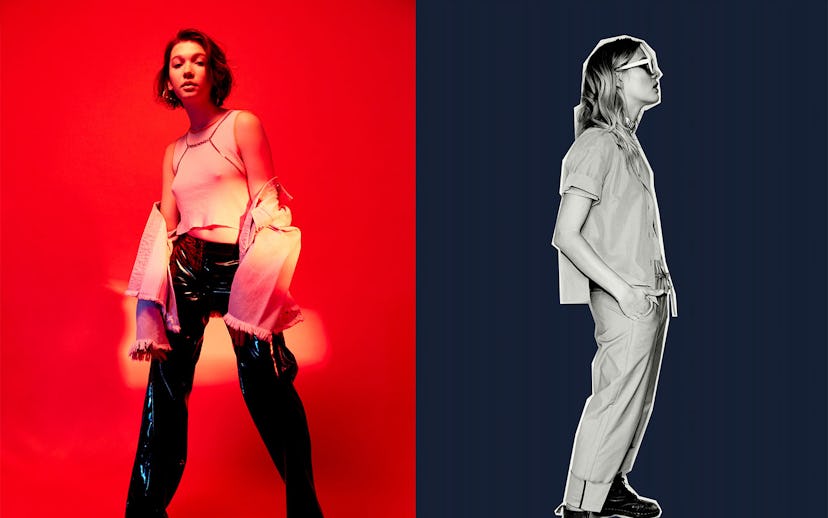 Dani wears top by Need, tee by Chinemachine Paris, pants by CHAPTER, choker OV US NYC, stylist's own ring. Frankie wears a top by Apiece Apart, jacket by Sandy Liang, pants by Dama.