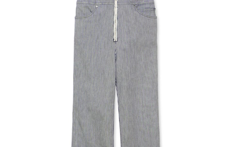 The pinstripe cotton fabric also alludes to the original wearers of this design (shout out to all of the railroad workers out there!) while modern detailing like an exposed zipper and more high-waisted pants make this the perfect piece to wear to brunch.