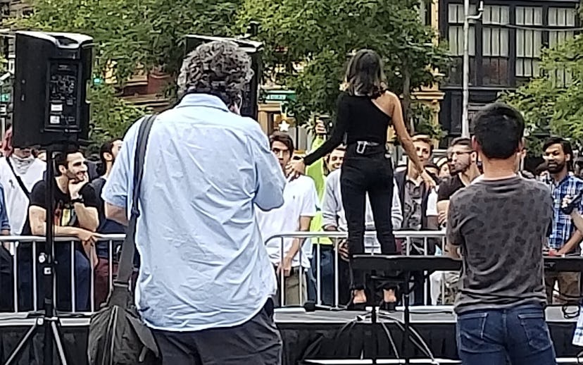 A week later, Aponte invited him to what she said was a DJ gig in Union Square. Misha agreed and showed up at their agreed location, where he found "a stage and a DJ and about 100 ppl and cameras"—though he chalked it up to just being "some random ass Manhattan shit." However, it didn't take long for him, and several other men interviewed by Select All, to realize something was terribly amiss.