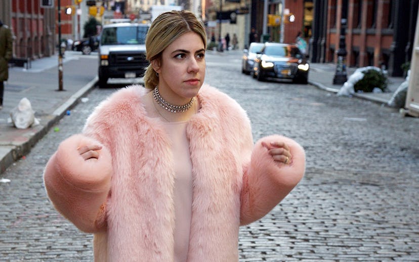 On Marissa: coat: THPShop, Baby Pink Boxy Coat, $850, view at THPShop; dress: American Apparel, Gia Mini Dress, $54, view at American Apparel; shoes: Puma by Rihanna, Creeper, $120, view at Puma; necklace: Dannijo, Prima, $495, view at Dannijo.