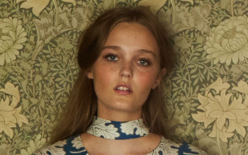 All clothing by Valentino. Hair: Rick Gradone for Oribe at Atelier Management. Makeup: Mia Yang for Dior Skin at Atelier Management. Nails: Kait Mosh at Cloutier Remix using Essie. Stylist's Assistant: Raina Selene. Makeup Assistant: Christina Roberson. Floral Arrangements: Yasmine Khatib at Yasmine Floral Design. Model: Elizabeth Morley at New York Model Management.