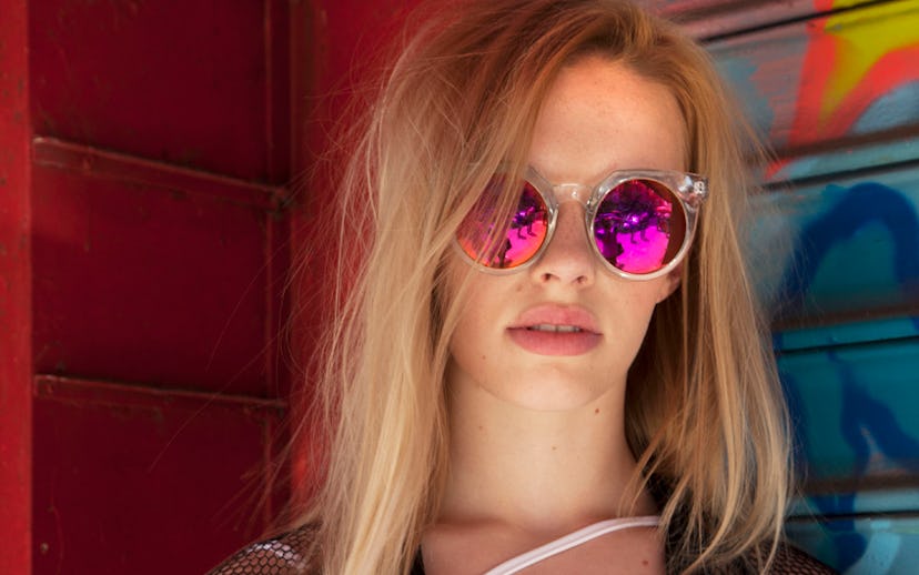 Nun Bangkok, Black Mesh Bomber Jacket, $58, available here. Scrap City LA, Asymmetric Strap Crop Top, $28, available here. H0les Eyewear, H0les Tortoise Cat Eye Sunglasses, $120, available here.