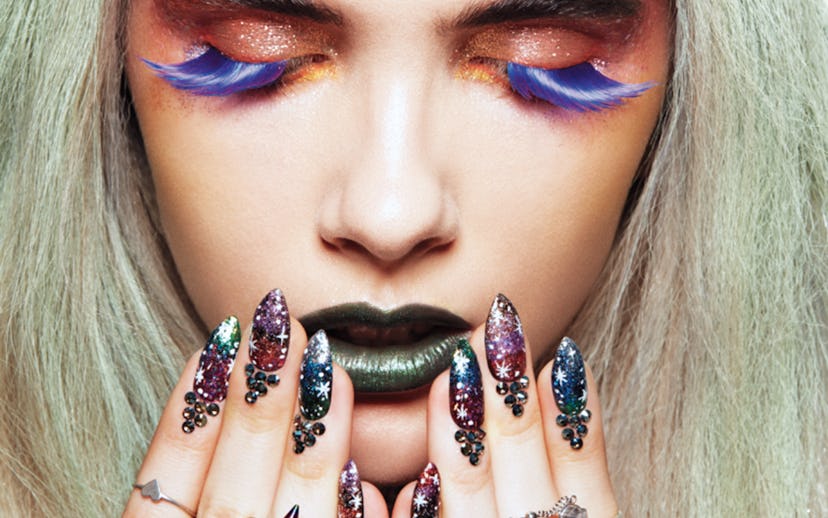 TRY THESE: manic panic siren's song classic cream formula and manic mixer pastel-zer classic cream formula\topshop beauty chameleon glow in shuffle the cards\lime crime opaque lipstick in serpentina\napoleon perdis faux lashes in orchid\swarovski crystal tabac hotfix rhinestones