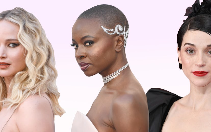 On tonight’s carpet, the focus was on the hair. While we saw a fair share of Old Hollywood-esque waves, we also saw a ton of interesting hairpieces, embellishments, and more. Andra Day and Haley Bennett both worked flowers into their looks, and we saw everything from a gold wire-entwined updo on Lupita Nyong’o to a head-turning hairpiece on Annie Clark. Of course, Danai Gurira won the beauty game by buzzing a design right into her scalp. There were plenty of color pops on the eyes and lips, too.