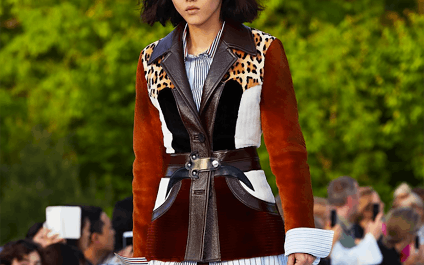 Legendary makeup artist and founder of eponymous beauty brand Pat McGrath never disappoints when she’s behind the scenes of a runway show, and today was certainly no different. According to Vogue, the collection was a love letter to the country, drawing inspiration from samurai armor, fisherman prints, and ‘70s Japanese film series Stray Cat Rock (which features a pretty badass girl gang). McGrath sent models—from Japanese actress Rila Fukushima to LV regulars Kiki Willems and Natalie Westling—down the catwalk with some statement cat eyes, paired with a striking graphic brow. McGrath also referenced Kabuki makeup, one of Ghesquière’s inspirations, by airbrushing contrasting, colorful pigments around the eyes and on the cheekbones.