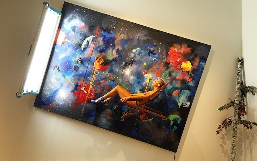 Take the boat ride, for example: In the middle of the gallery space, surrounded by paintings that could pass for Hieronymus Bosch on LSD, is a mini river designed for a single rider. Once inside, the boat is tugged through a grove of trees. The chaos of the world around the ride is replaced with the chaos of another, more centralized experience that’s jarring but thrilling at the same time. (The very act of being in a boat, in the middle of Tribeca is pretty neat.) That juxtaposition between the “gross” and the “beautiful” is where the show shines because at its heart it's exploring our relationship to mass media, indulgence, exploitation, gossip, and “real beauty.” (Look no further than the tanning bed lamp shining on a very orange Tea Hacic, hovering on a wall before a cosmic painting.) Ascending into a levitating cube, a video of costumed individuals rapidly consuming food brings to mind irksome movie scenes of gluttony, but the humor in the way it’s presented makes it bearable. That thread of funny keeps the show from being too heavy; it’s a little nihilistic, but what can you do when the world is moving at an astronomic rate, descending further and further into these false beliefs? Behold! is a commentary on the comedy of errors we live in. How beautiful. How grotesque. How very New York.